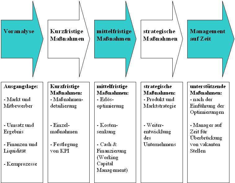 In der dritten Phase starten wir mit den Maßnahmen zur Erreichung des mittelfristigen Maßnahmenplan, die wir konzeptionell im kurzfristigen Maßnahmenplan festgelegt haben. Unser Schwerpunkt liegt auf der systematischen Optimierung der Erlöse, der Personal-, Material- und Sachkosten sowie der Cash-Position. Darüber hinaus arbeiten wir an Produktivitätssteigerungen der operativen Kernprozesse.